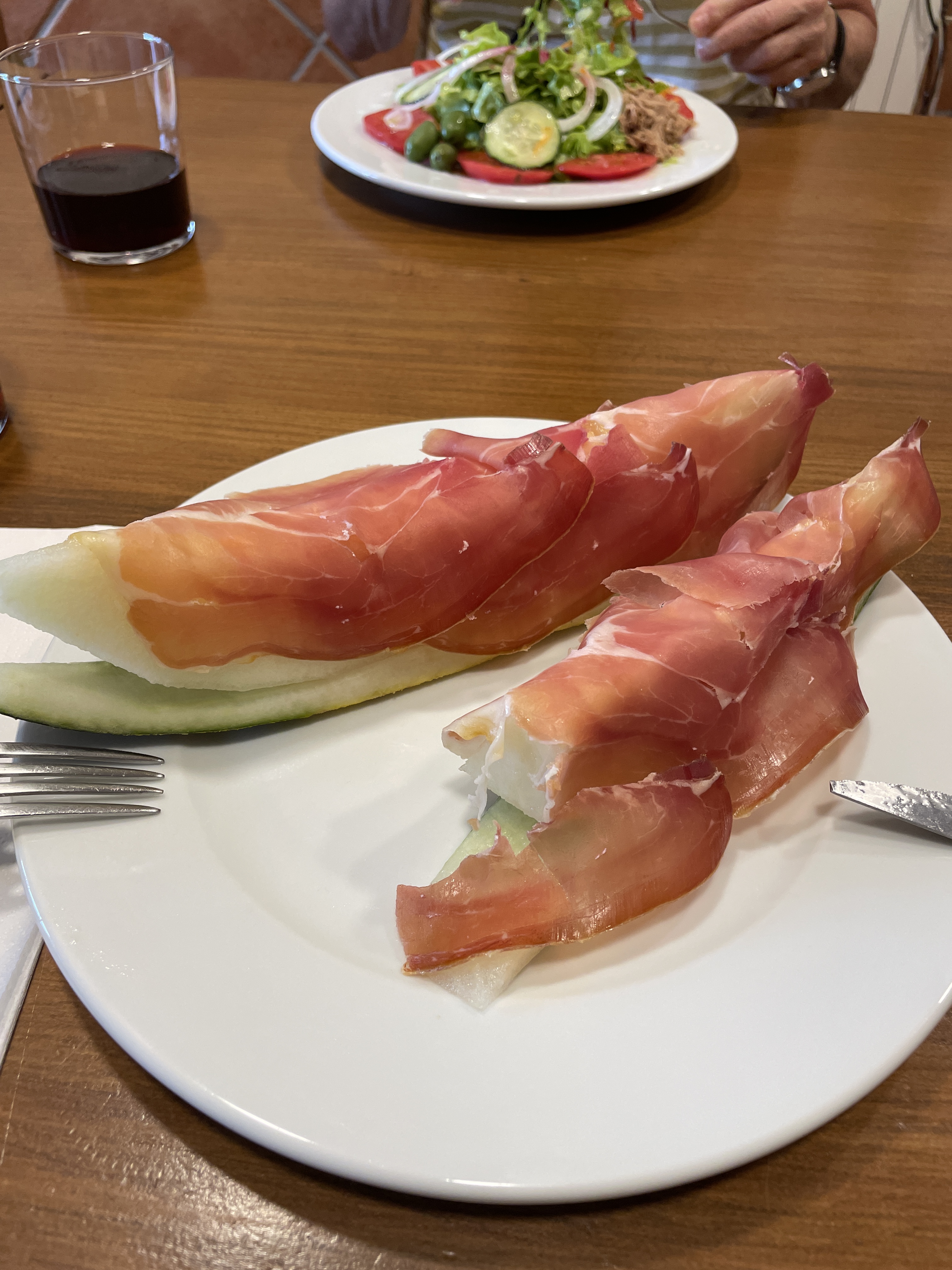 We later joined the communal dinner at the hostel for €16 each. Mum had a salad to start and chicken with potatoes for her main, while I had melon and ham as my starter and beef with potatoes for my main. For dessert we got a fruit salad type thing. Mum headed upstairs soon after dinner while I stayed and chatted with some of the others – a couple from the Netherlands and a guy from Barcelona. They’re all planning on a 30km day tomorrow, so I suspect we won’t see them again at the next stop!