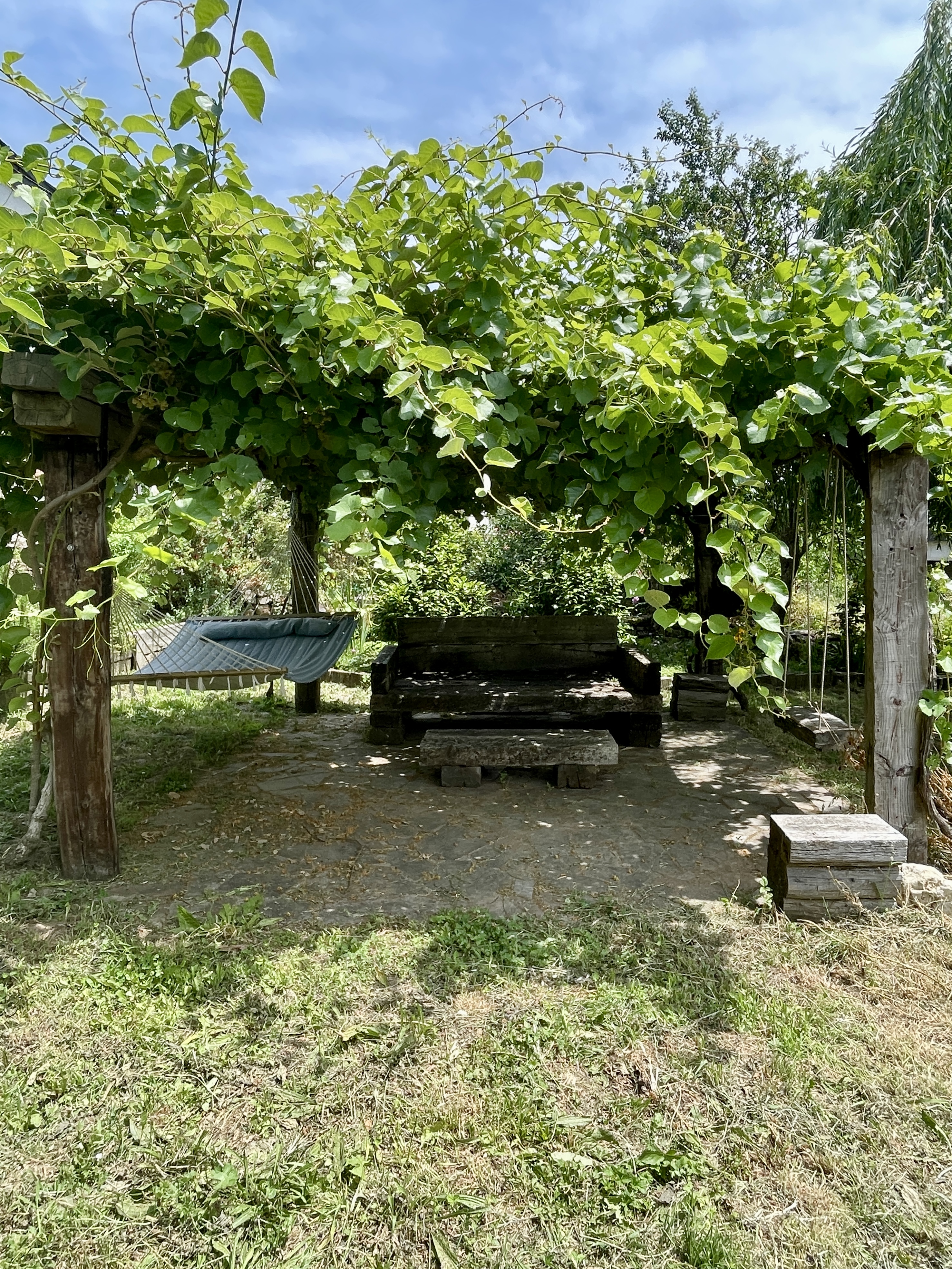 Due to the shorter distance, we arrived pretty early – about 2 hours before the albergue opened. The owner came out and met us though, and invited us to use their garden to relax in while we waited. They had a lovely wee area with seats and a swing and a hammock, covered in grape and kiwifruit vines, and surrounded by other fruit trees and vegetable gardens. After an hour and a bit we wandered off to find some lunch, then were back in time for check in.