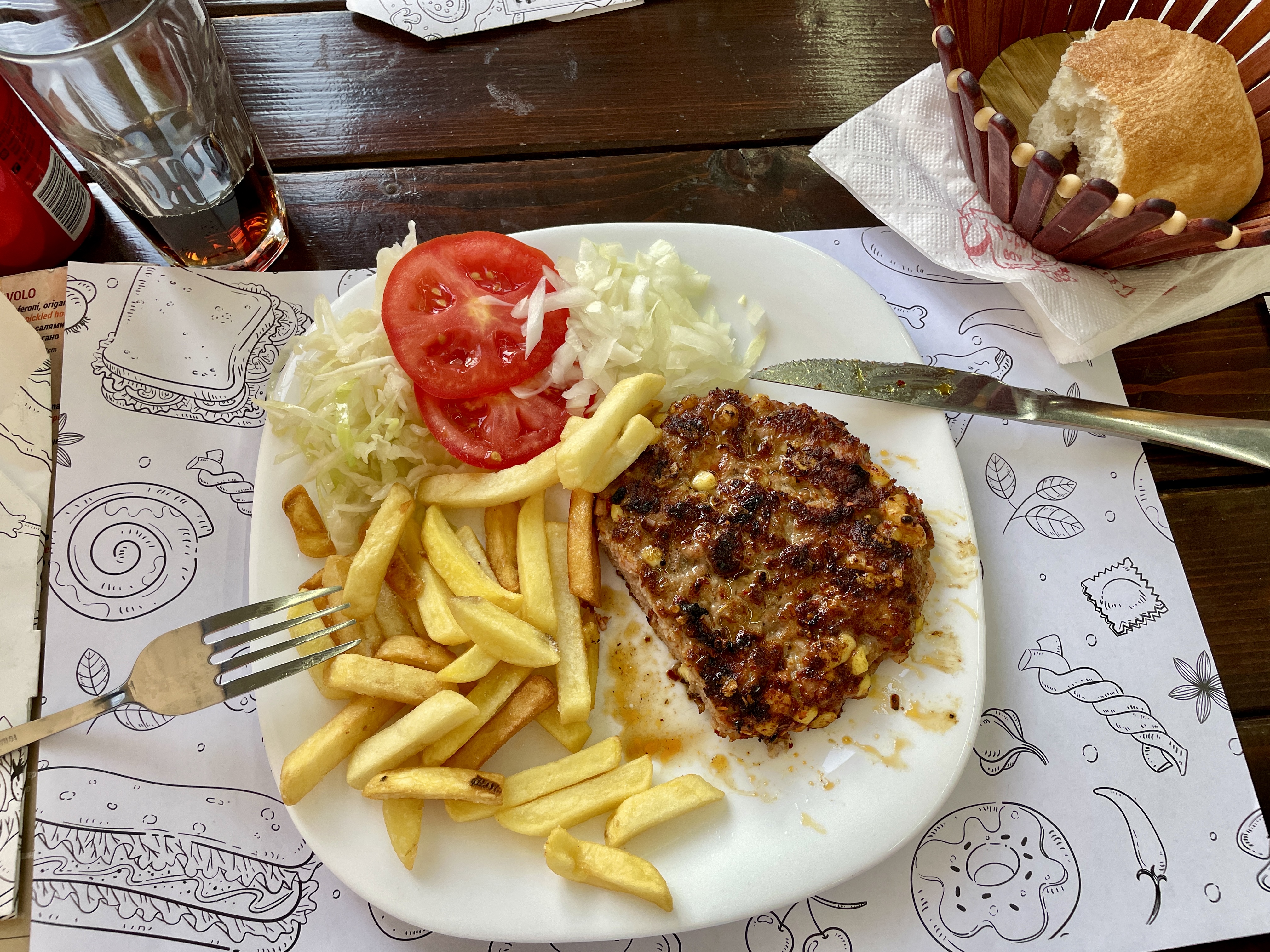 Dinner was just down the road at a place we were recommended, the name of which translated to “Eat at Joe’s”. We weren’t really sure what to choose, but the waitress made us a recommendation and we went for it. I’m glad we did, because it was probably one of the tastiest things I have eaten since leaving NZ! I mean, the salad and chips were salad and chips, but the meat was a new experience. It was essentially a meat patty, but it had a spicy seasoning on it, and bits of cheese and bacon pressed into the outside. It doesn’t sound particularly healthy, but it was yum!!