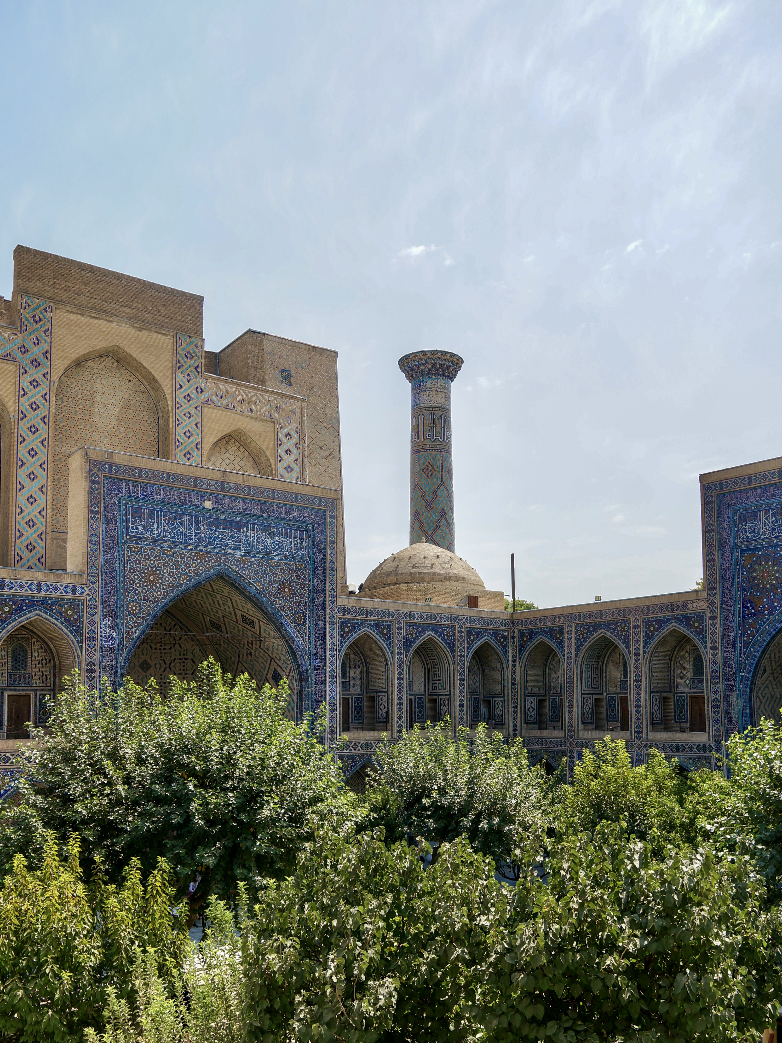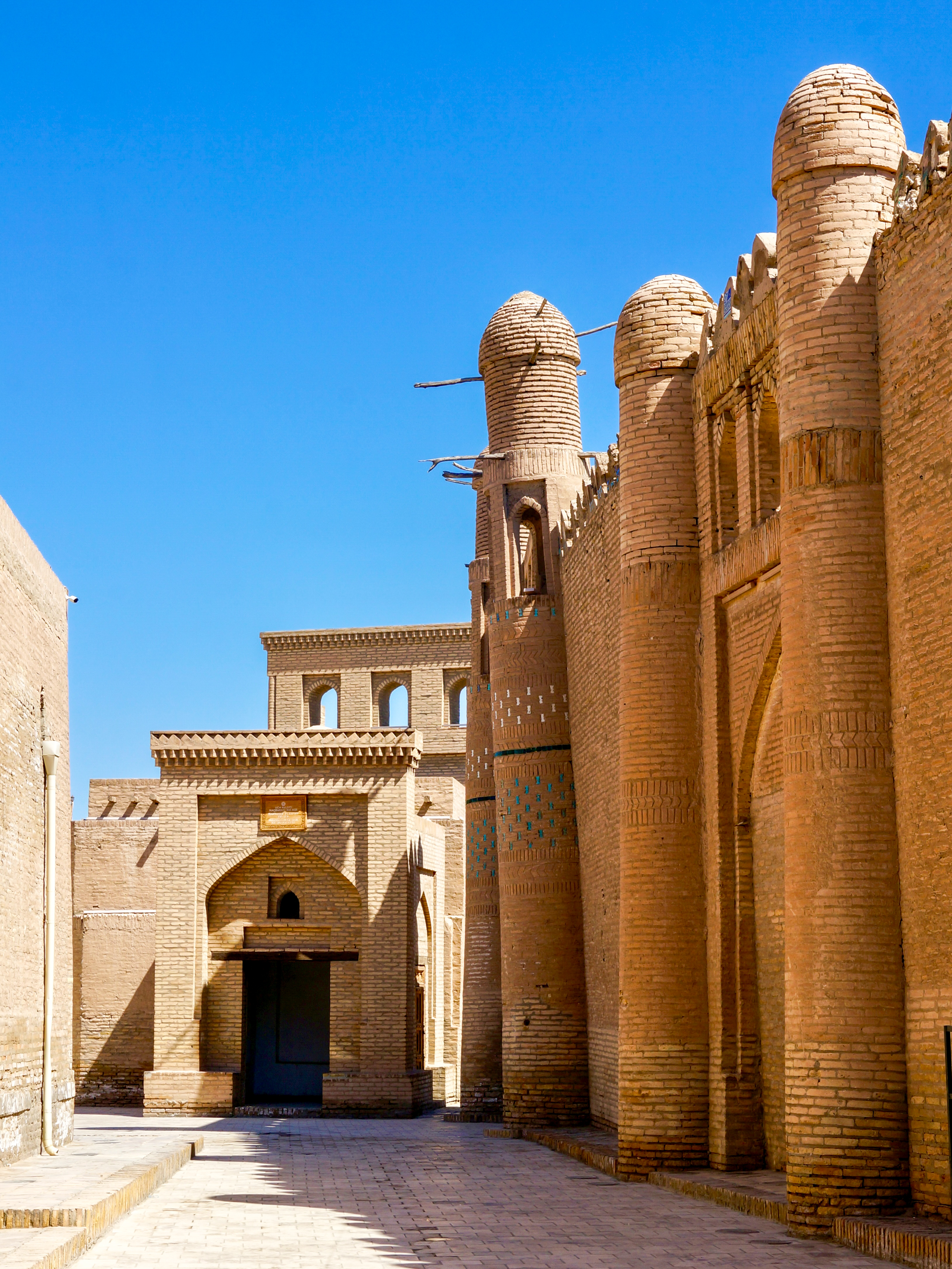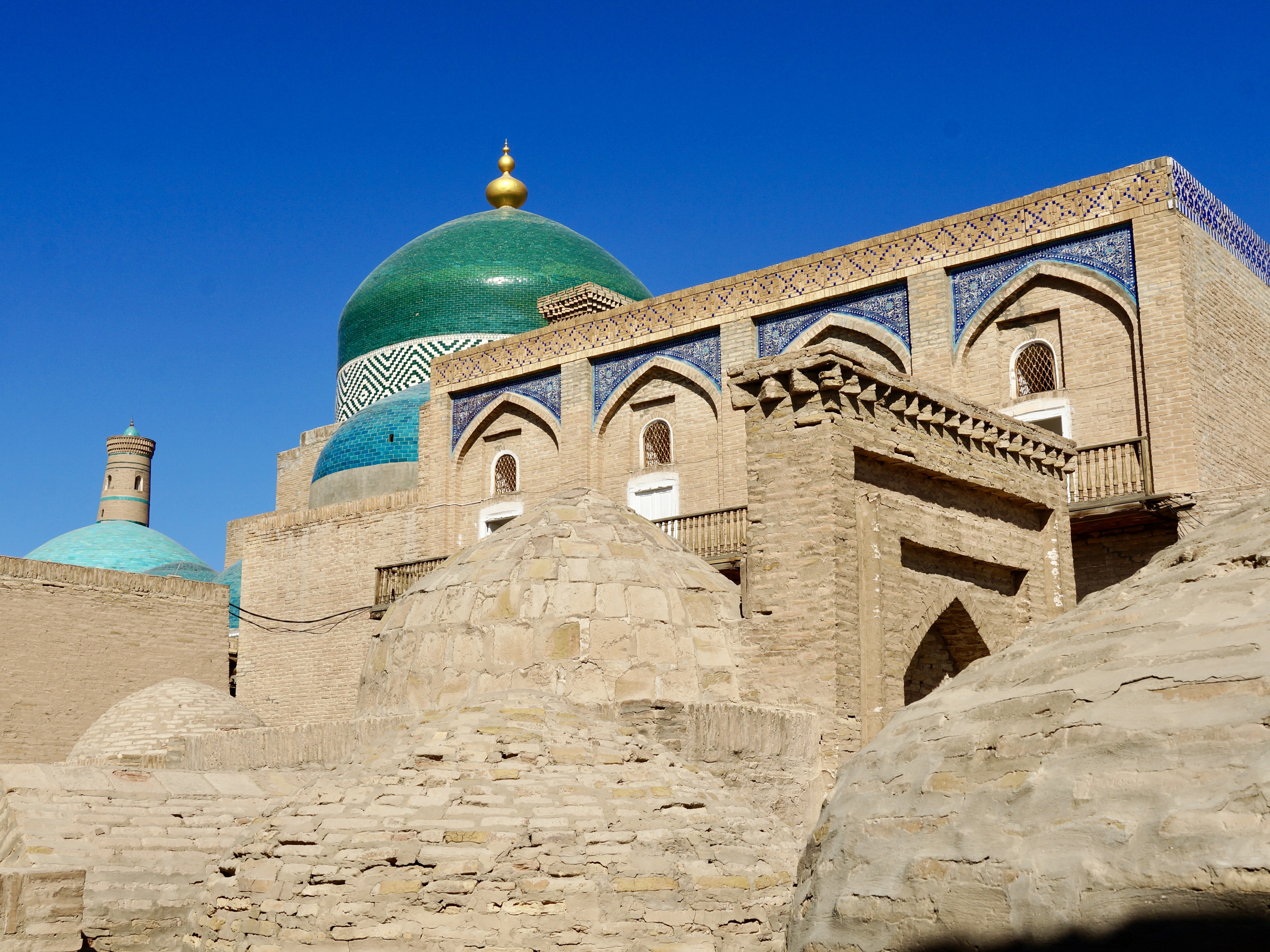 We spent most of our time in Uzbekistan visiting three historical cities, Khiva, Bukhara, and Samarkand, followed later by a short stop in the capital city, Tashkent. All three cities had an old town at their centre, and have of course now grown significantly around these. Walking through the centres you find yourself in lots of interesting little alleyways lined with brown clay buildings. Scattered throughout are mosques, minarets, and madrasahs, all decorated beautifully in blue and green tiles.