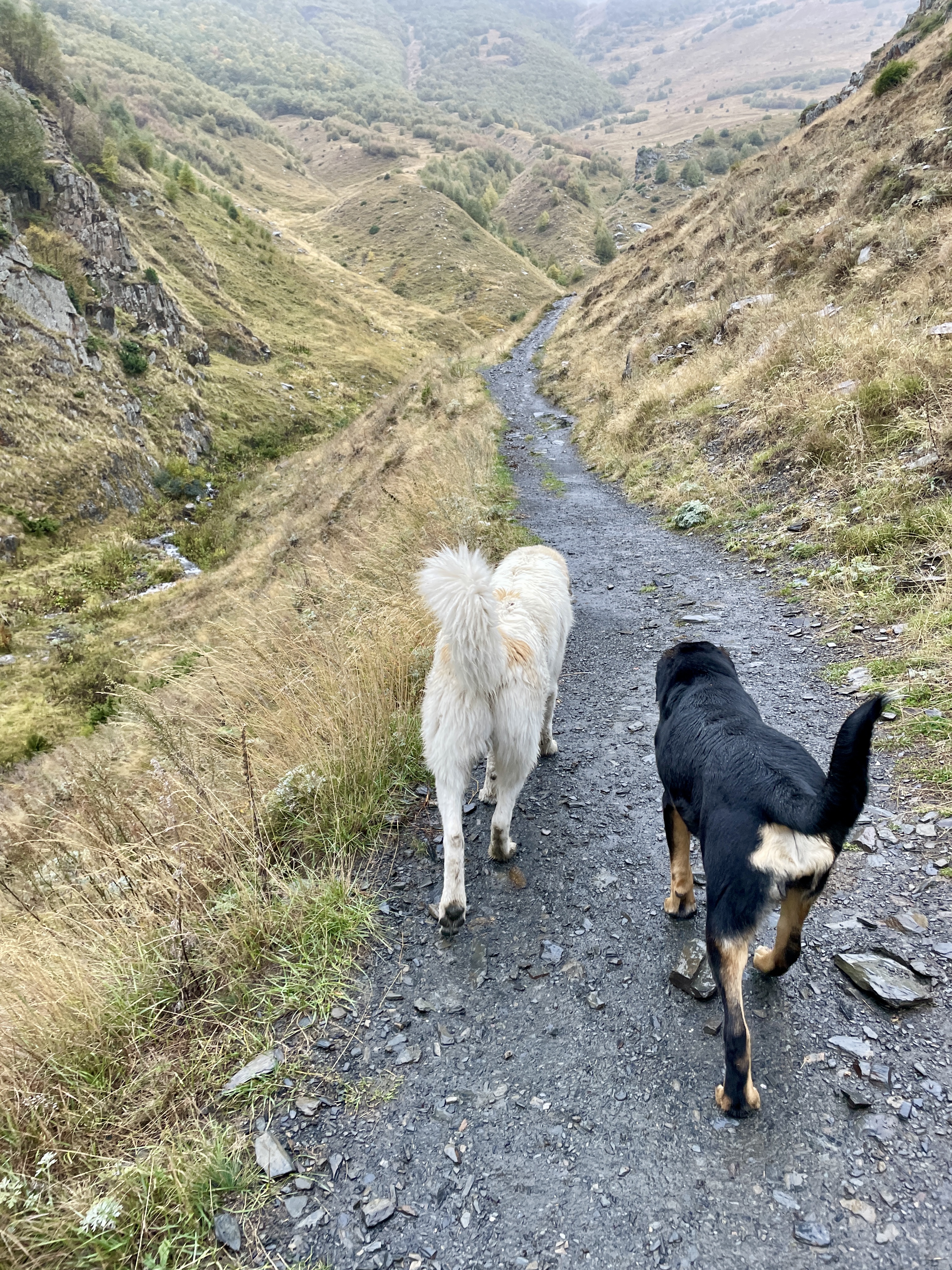 I waited until the rain was only light, and I set out, up the road towards the mountains. It started well! I found the trail, the rain wasn’t too bad, the scenery was mostly blocked by clouds, but what I could see was pretty. I was joined by some stray dogs for part of the walk. And then it started raining harder. And harder. And I started walking faster and faster, but the path was getting steeper and steeper!